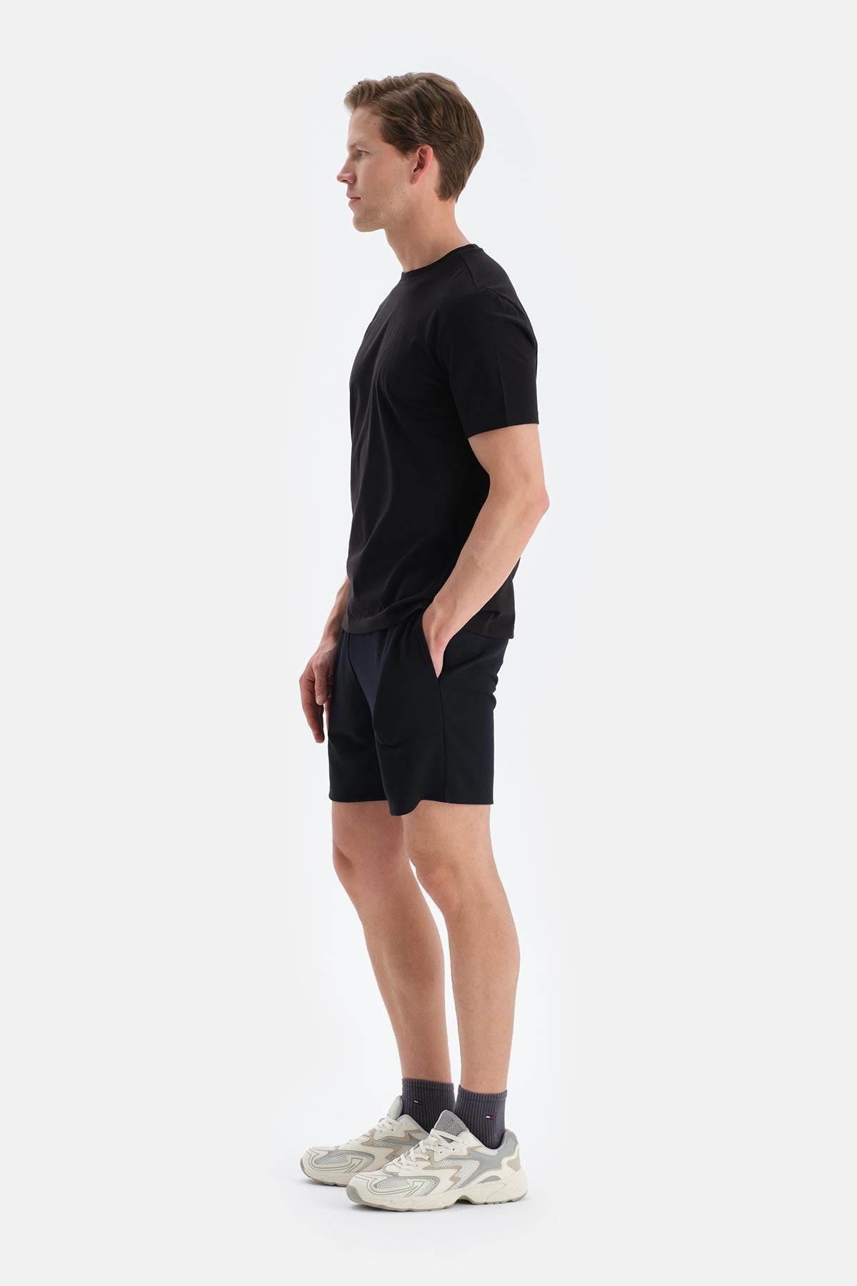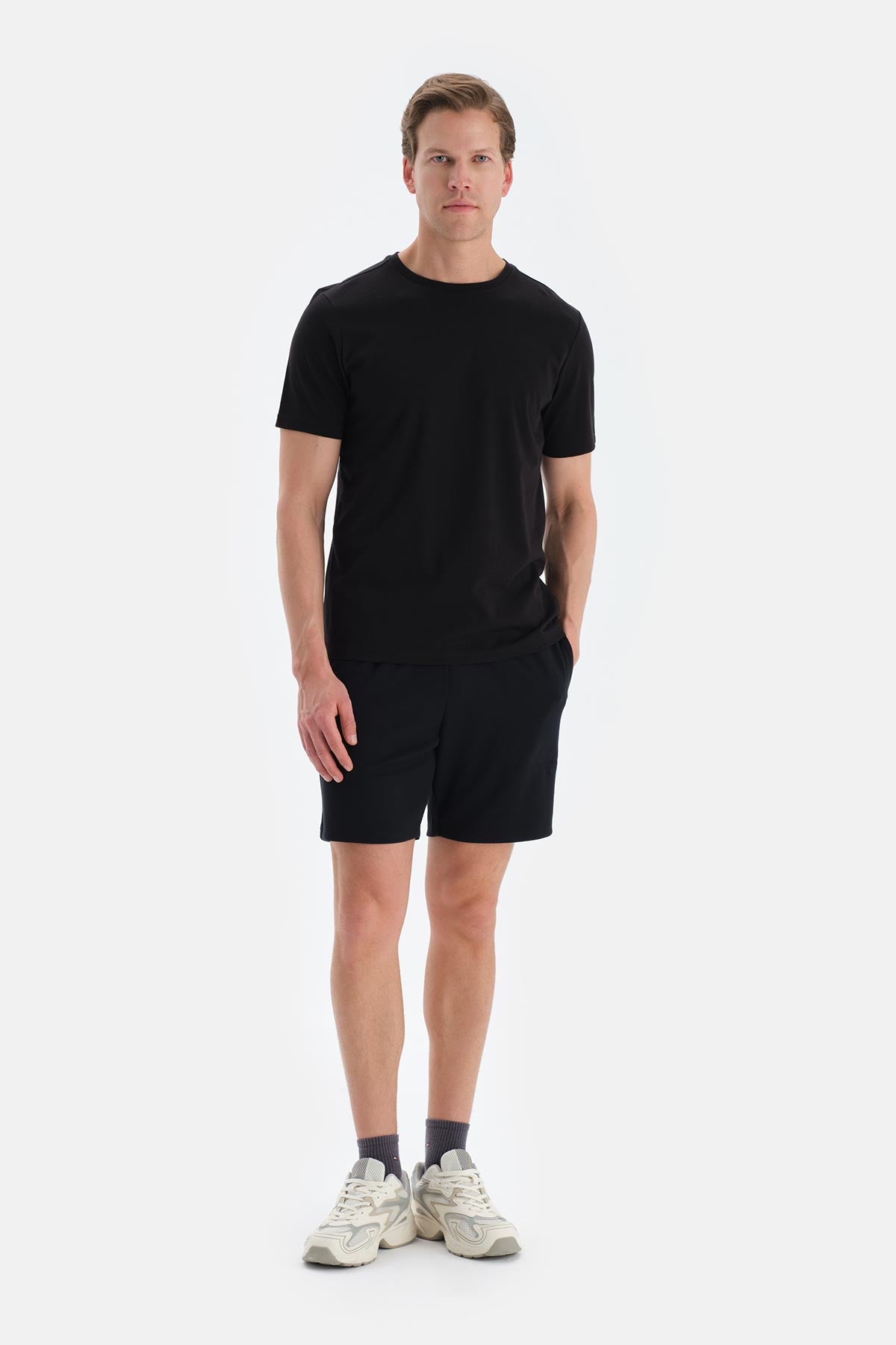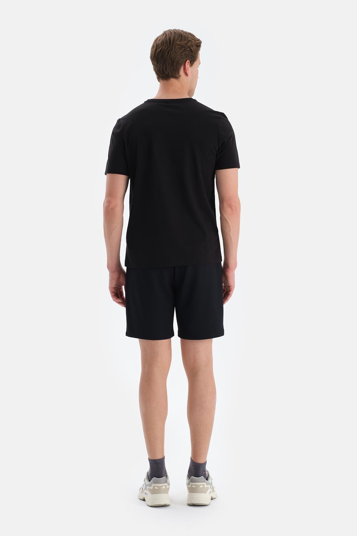 Siyah Bisiklet Yaka Ipek Apre Kısa Kollu Tişört