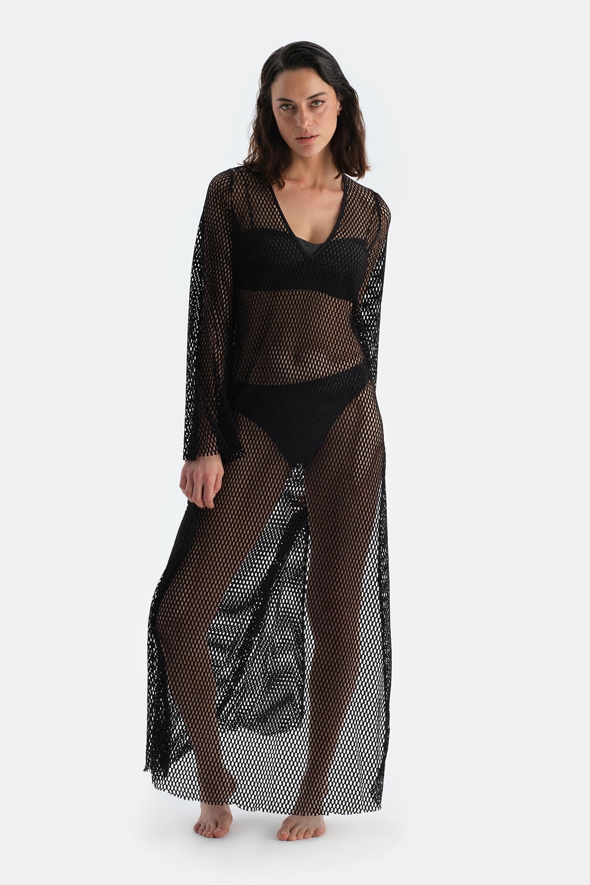 Siyah File Uzun Kol Elbise