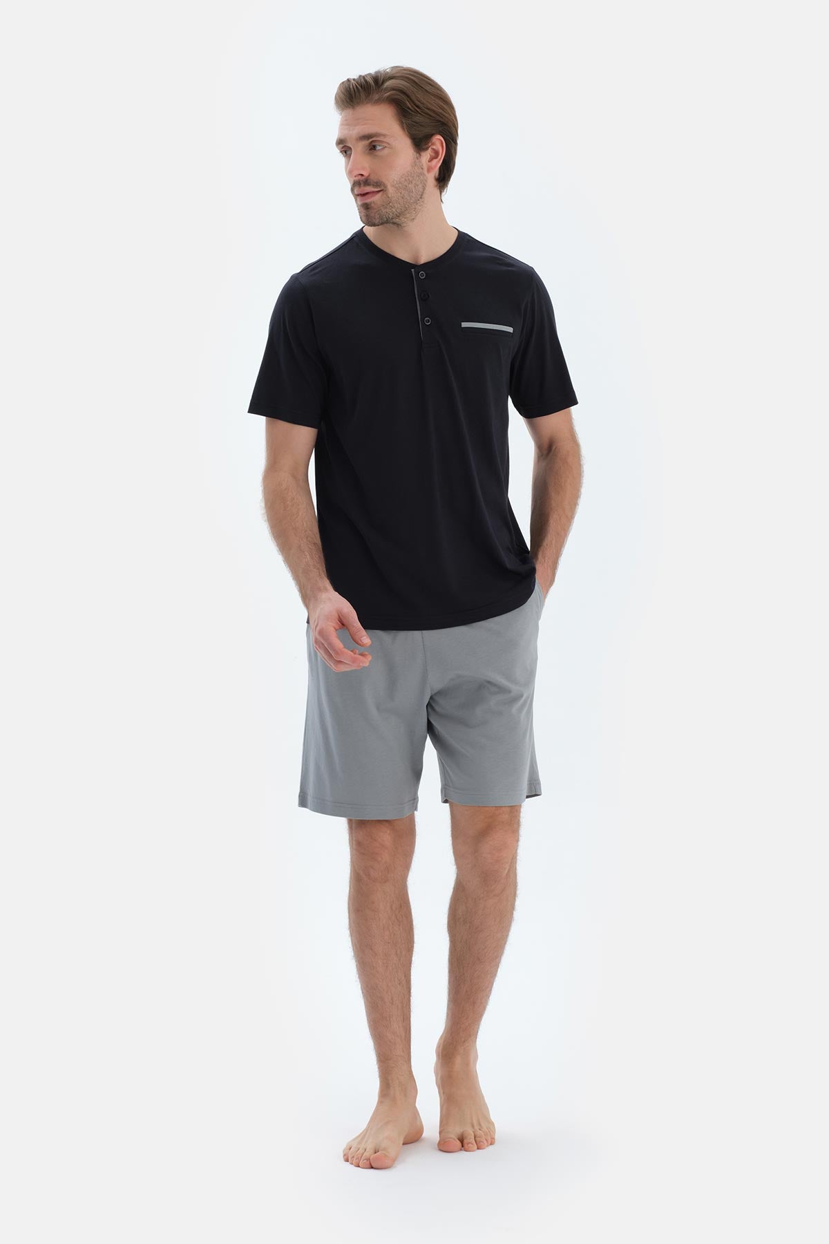 Siyah Yarım Patlı Kısa Kollu Şort Pantolon Üçlü Pijama Takımı