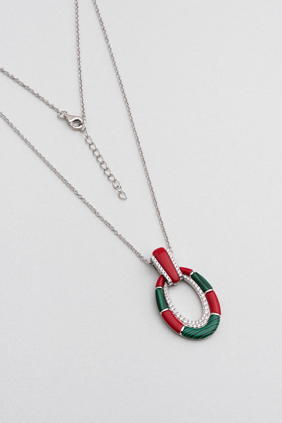 Malahit Ve Mercan Taşlı 18 Ayar Beyaz Altın Kaplama 45 Cm Gümüş Tasarım Kolye 07301400899