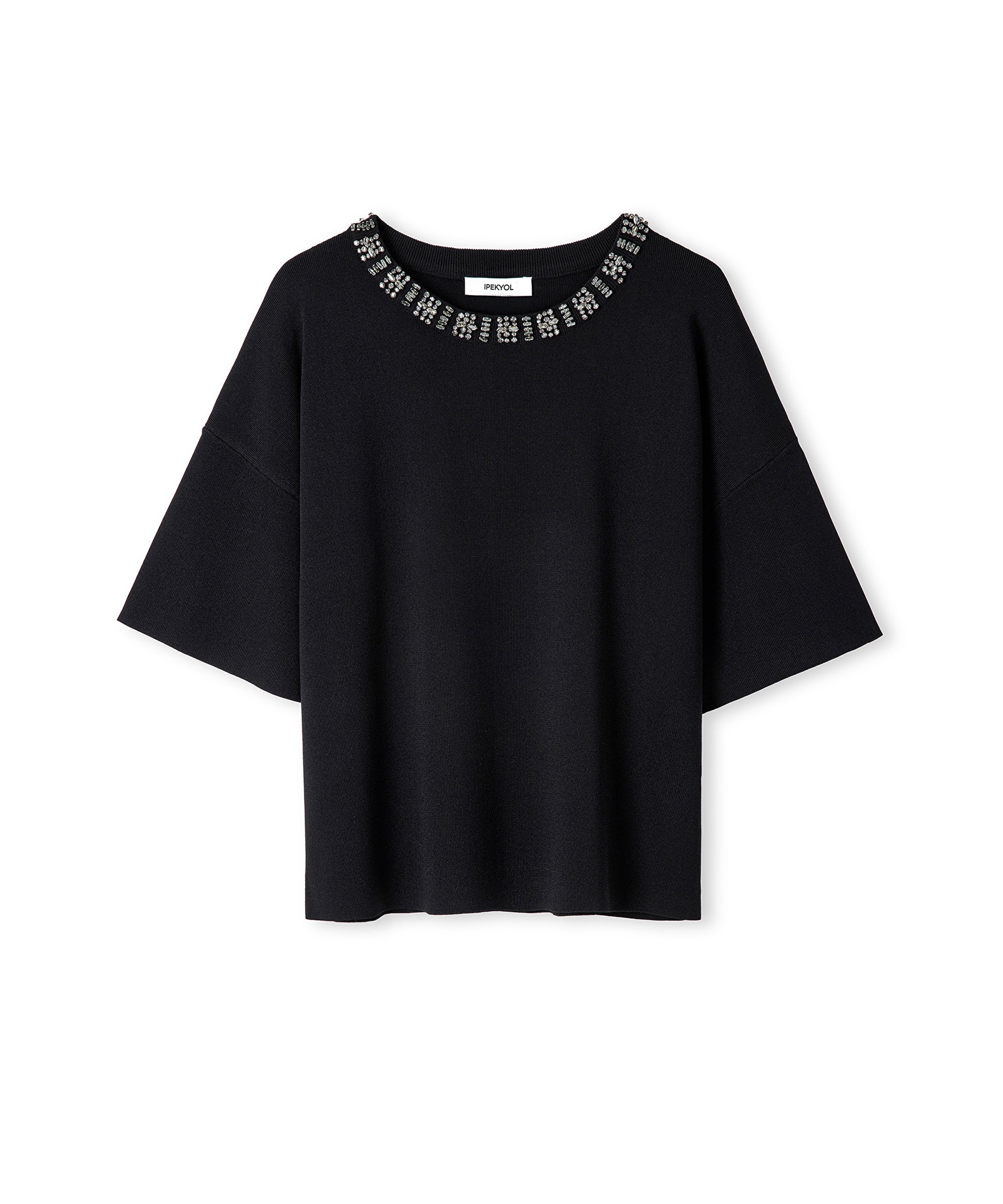 Siyah Strass taş aksesuarlı oversize triko IW6250050063001 ile tarzınızı tamamlayacaksınız. IPEKYOL tarzına sahip olmak için hemen tıklayın!