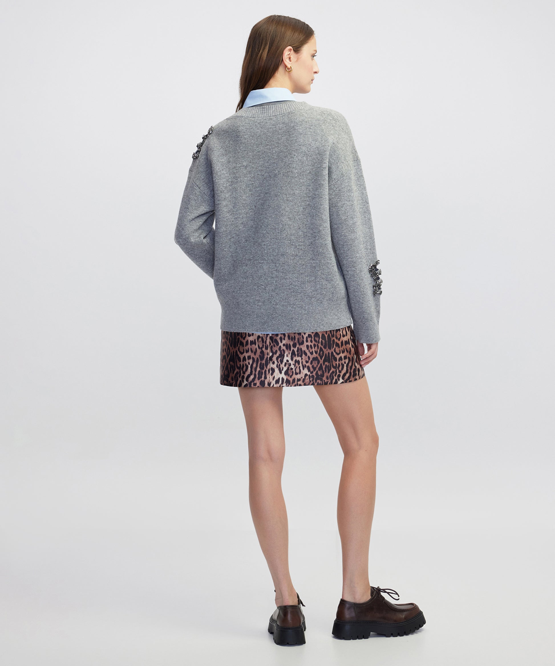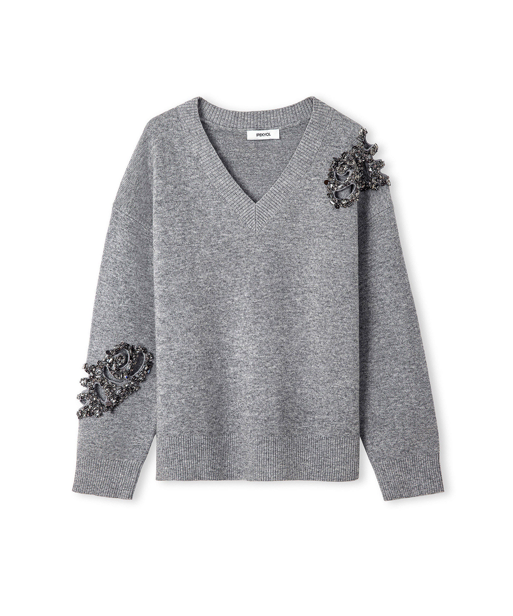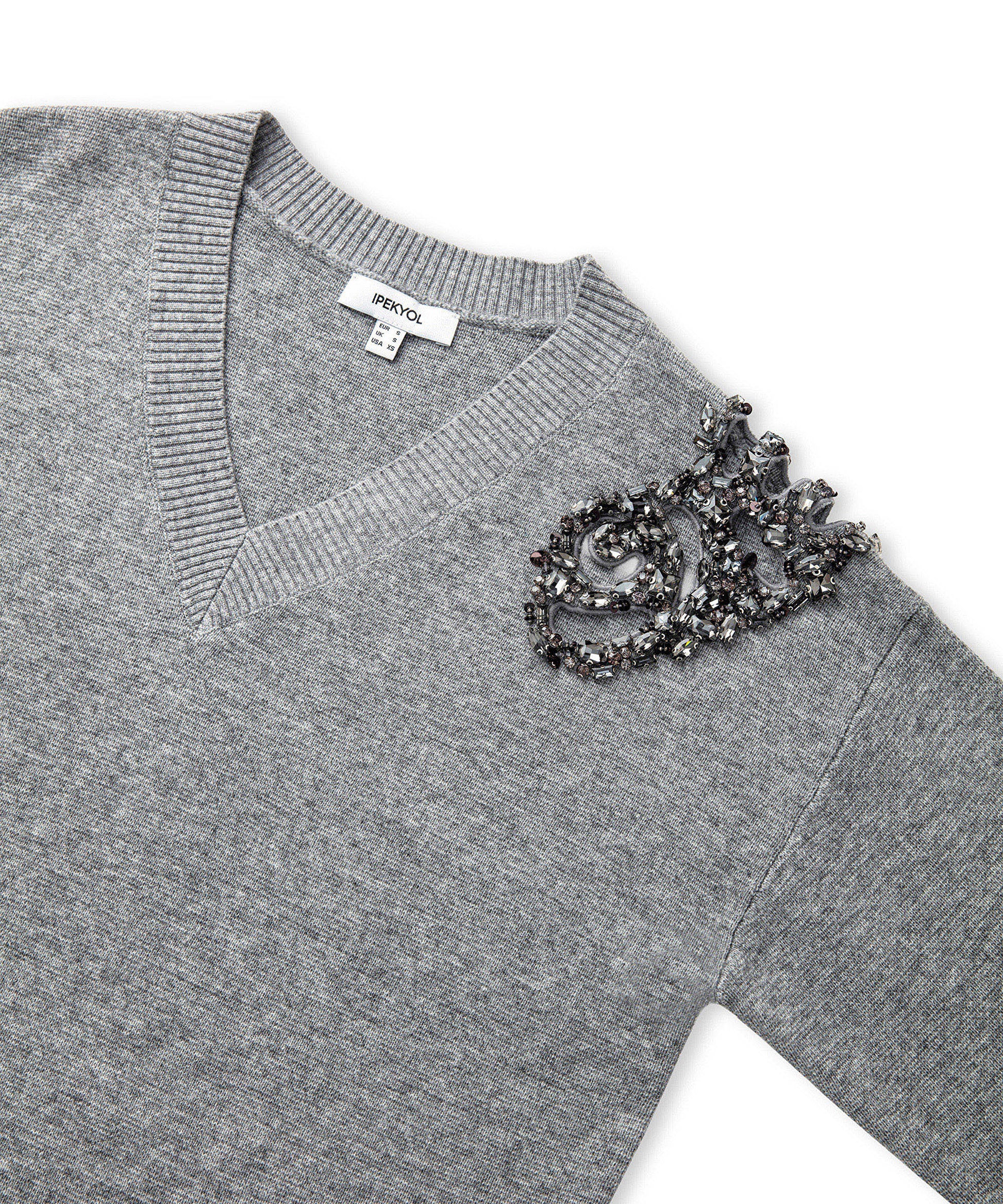 Gri Strass taş ve payet aplikeli triko IW6250050399005 ile tarzınızı tamamlayacaksınız. IPEKYOL tarzına sahip olmak için hemen tıklayın!