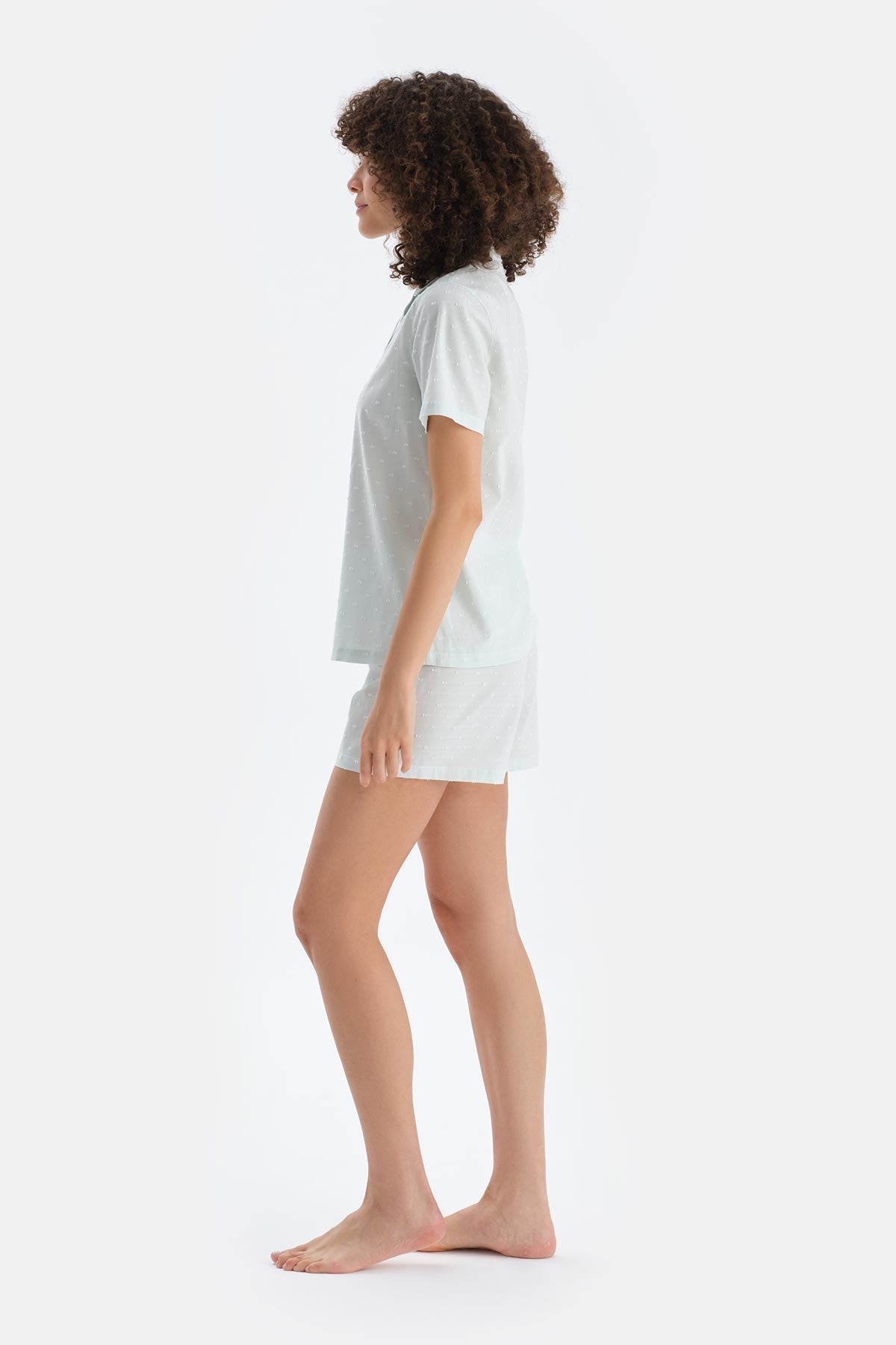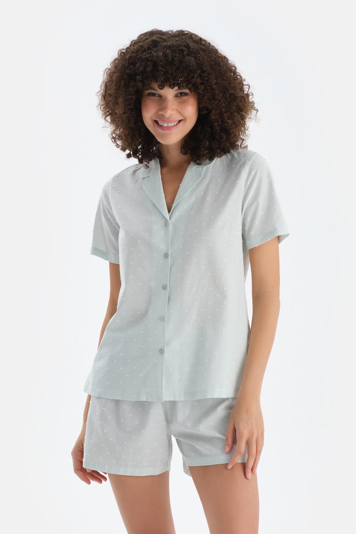 Turkuaz Puantiyeli Kısa Kollu Dokuma Gömlek