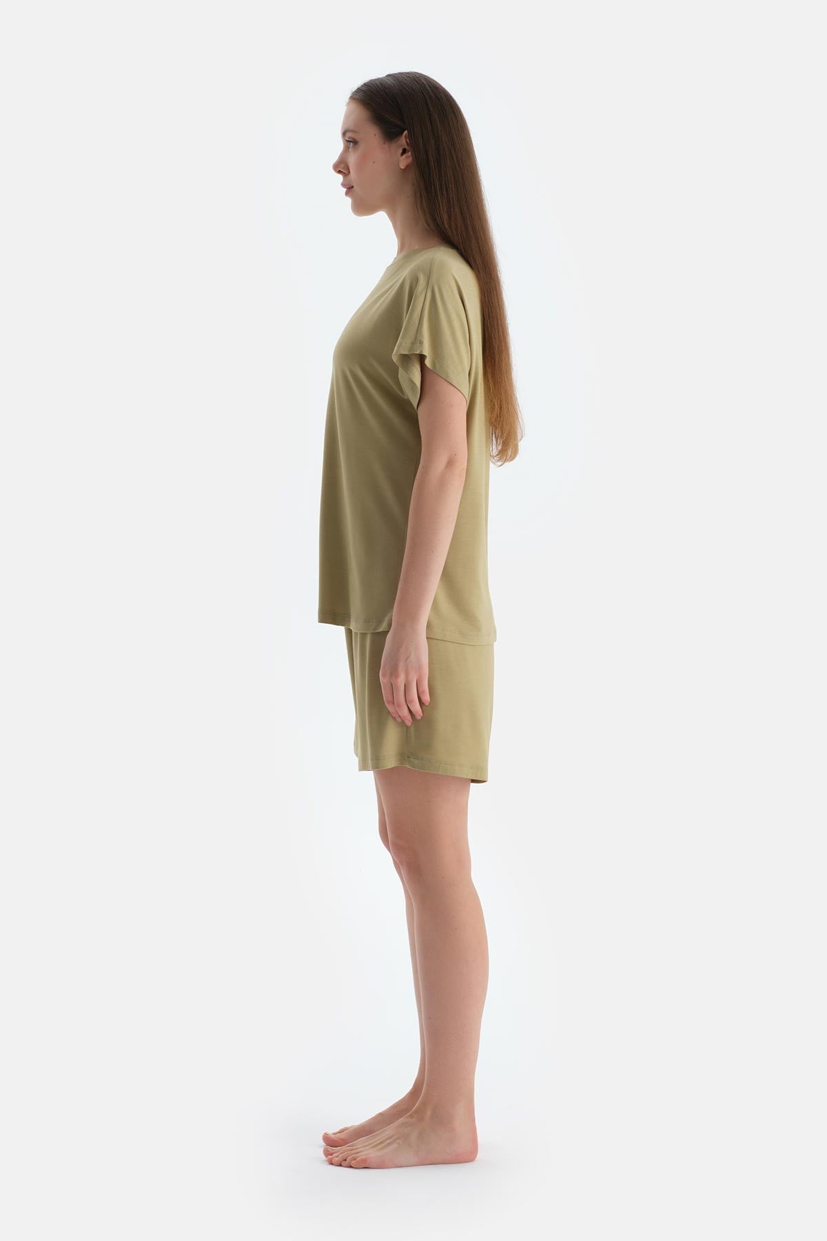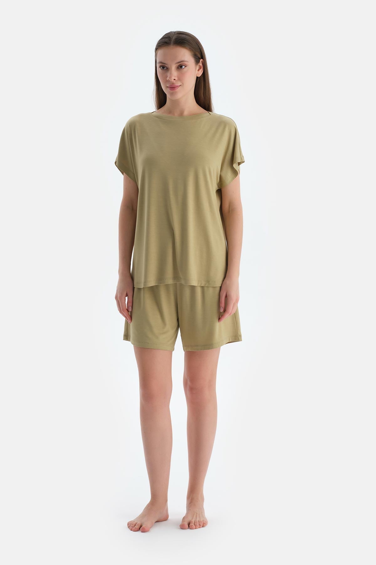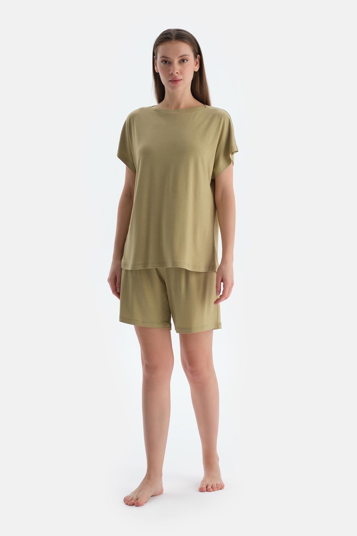 Yağ Yeşili Düşük Omuzlu Kısa Kollu Viskon Tişört Şort Pijama Takımı